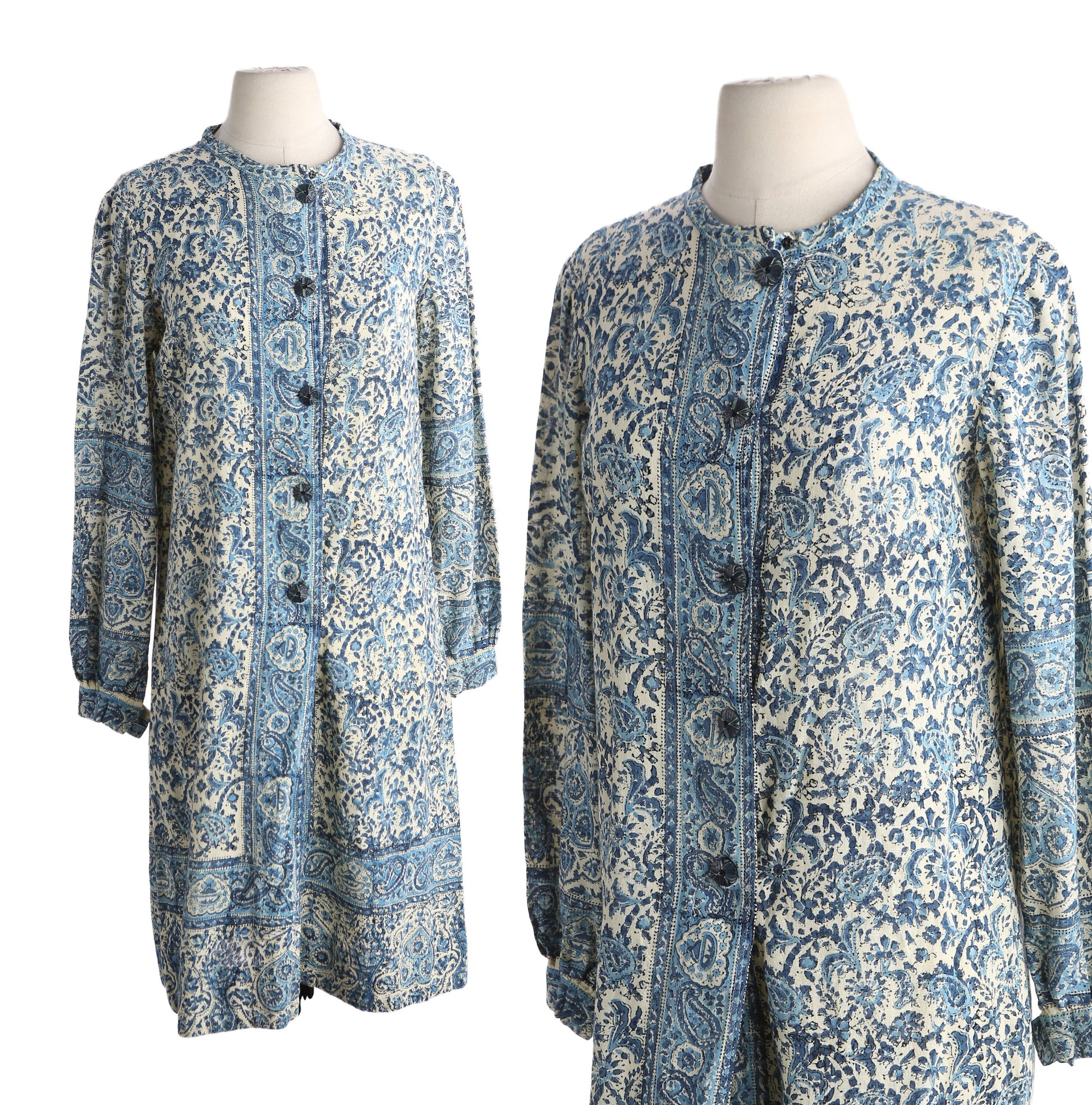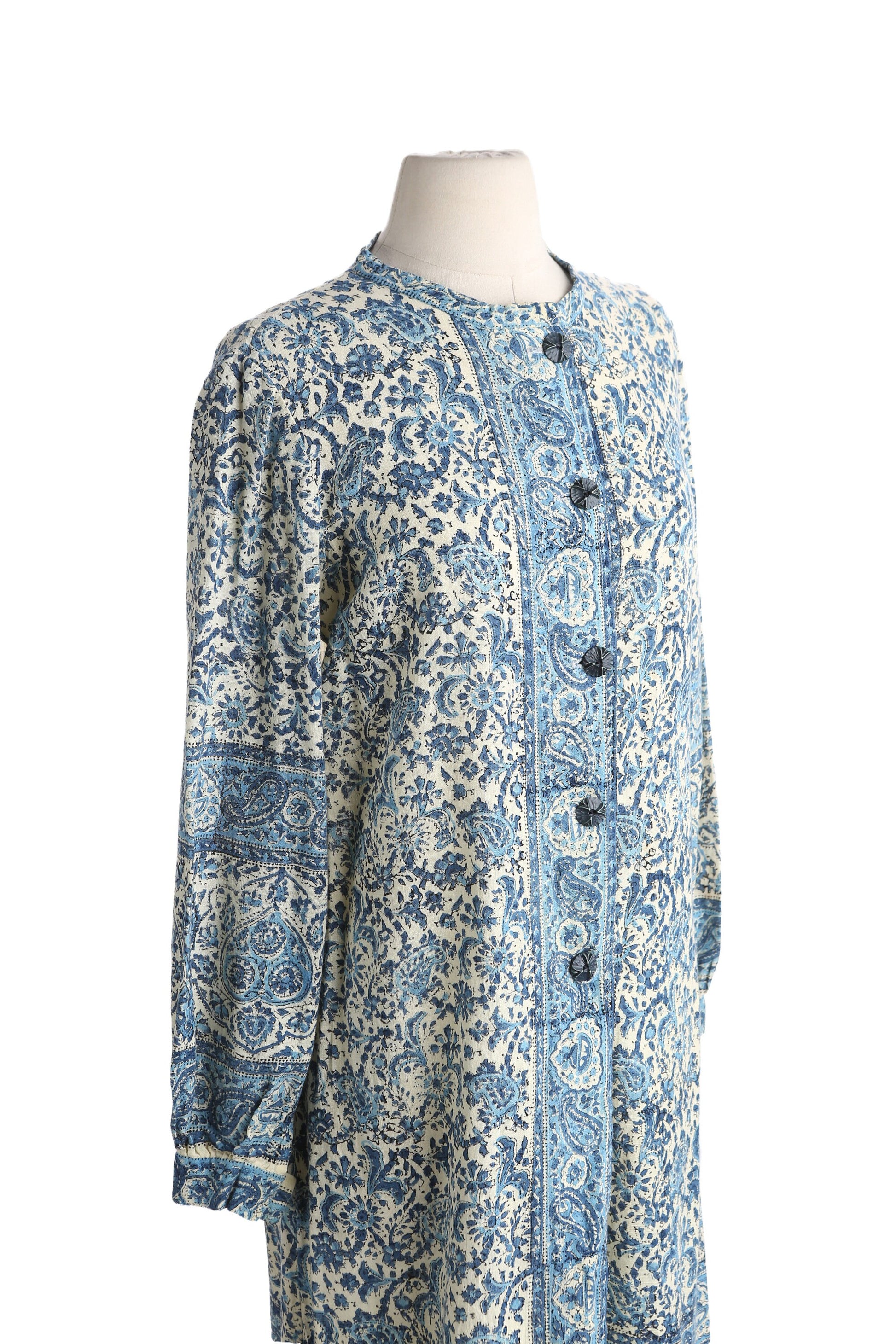 Vintage Women Block Print Blue Paisley Button Down Dress Boho