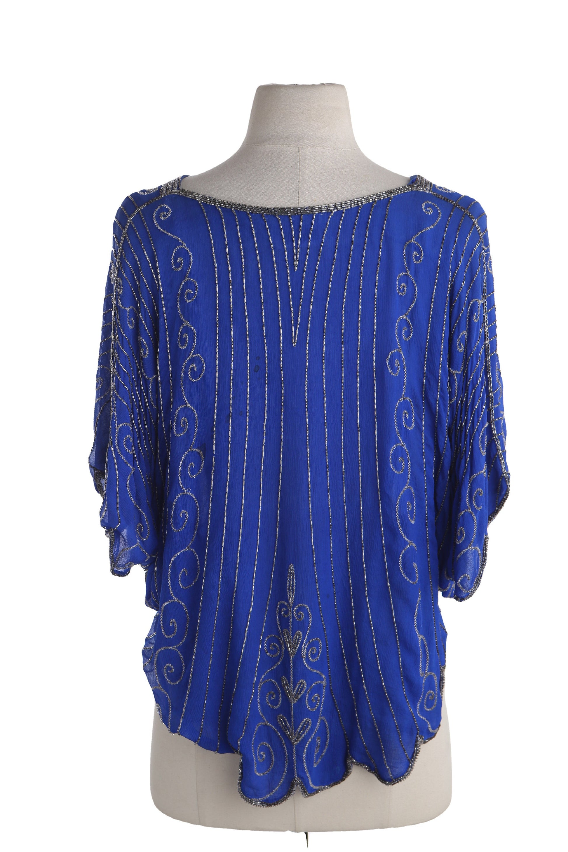 Vintage Women Blue Silk Oversized Blouse with Embroidered Beads by Swee Lo / Made in India / Era 1970s - 1980s