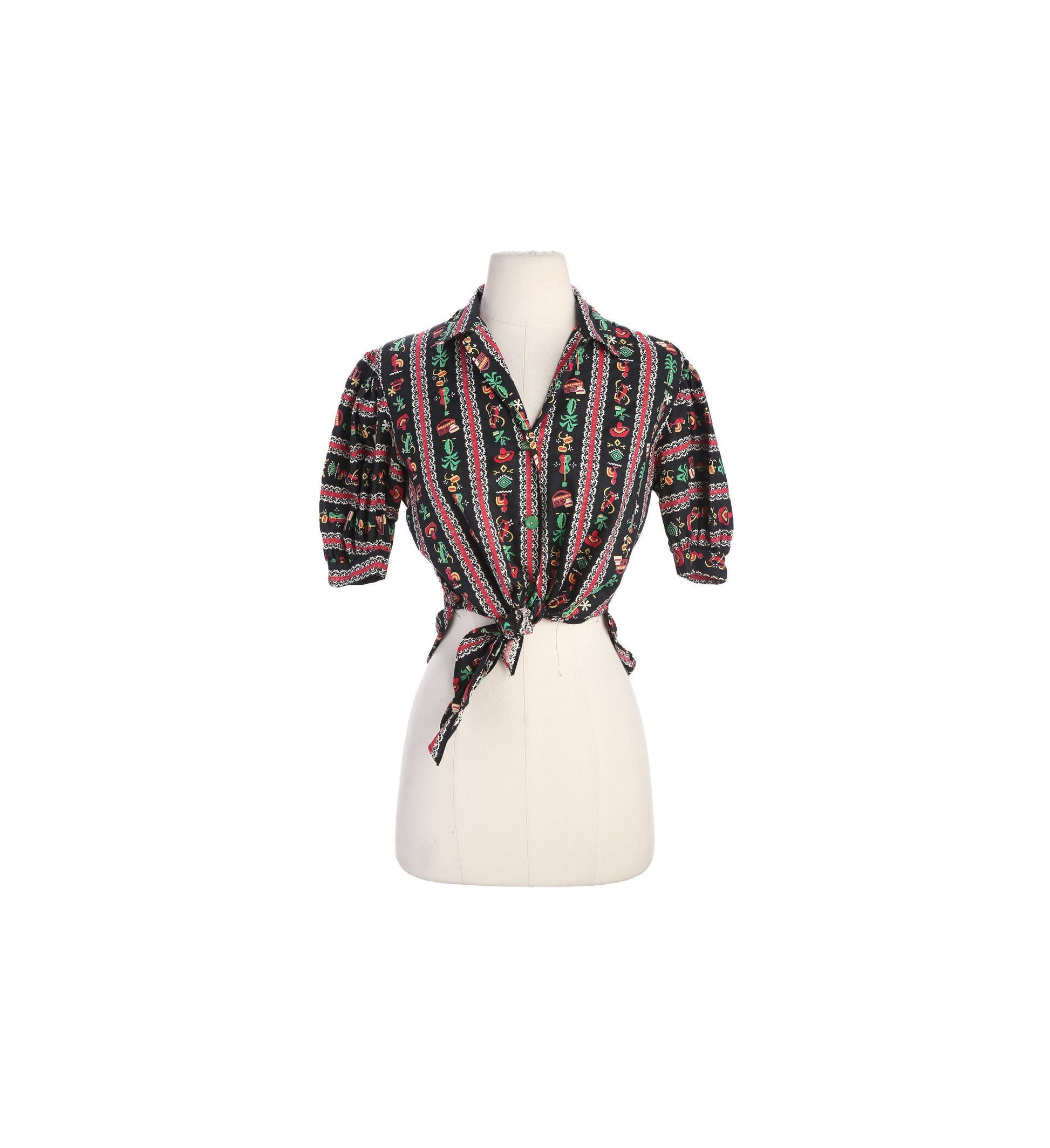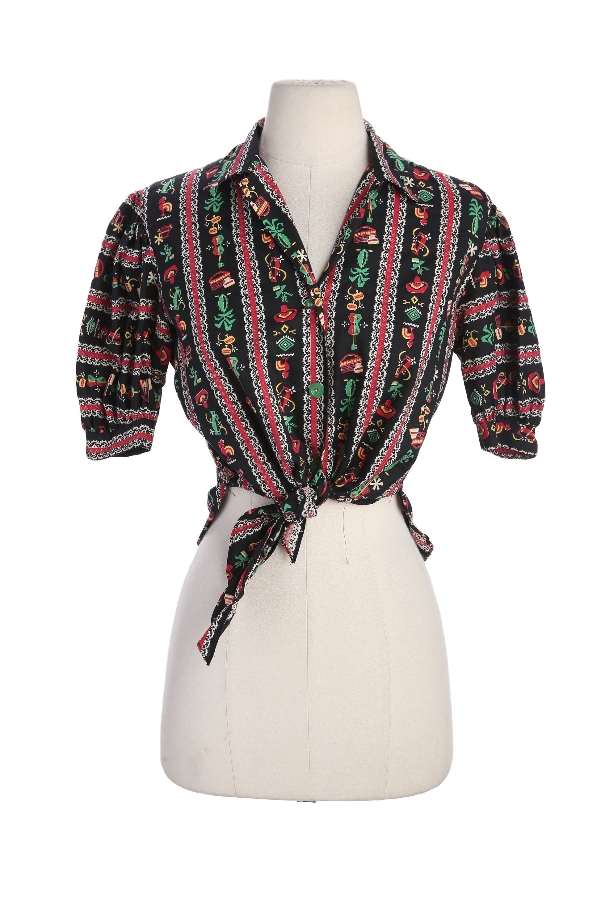 Vintage Women Cotton Short Sleeve Mexican Fiesta Print Button Up Blouse - Estimated Era 1940s - 1950s