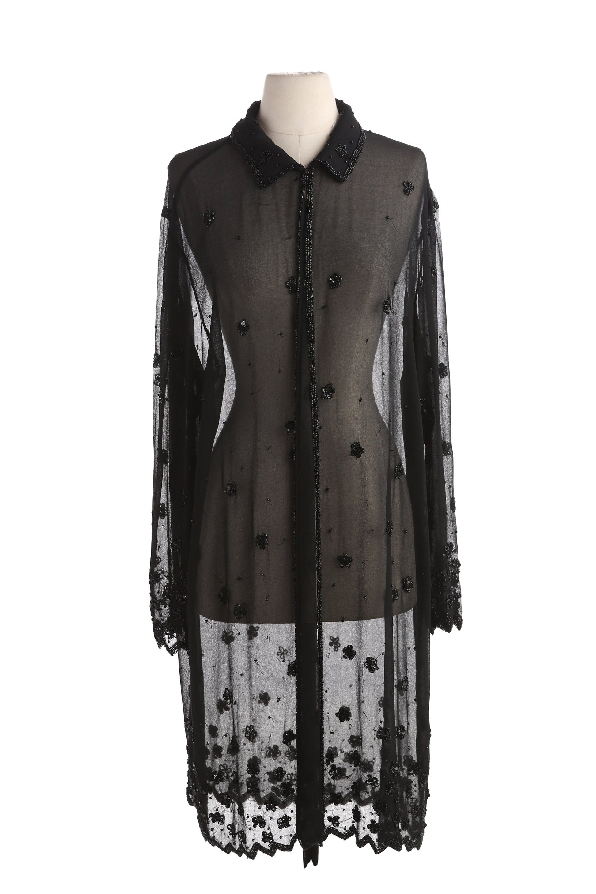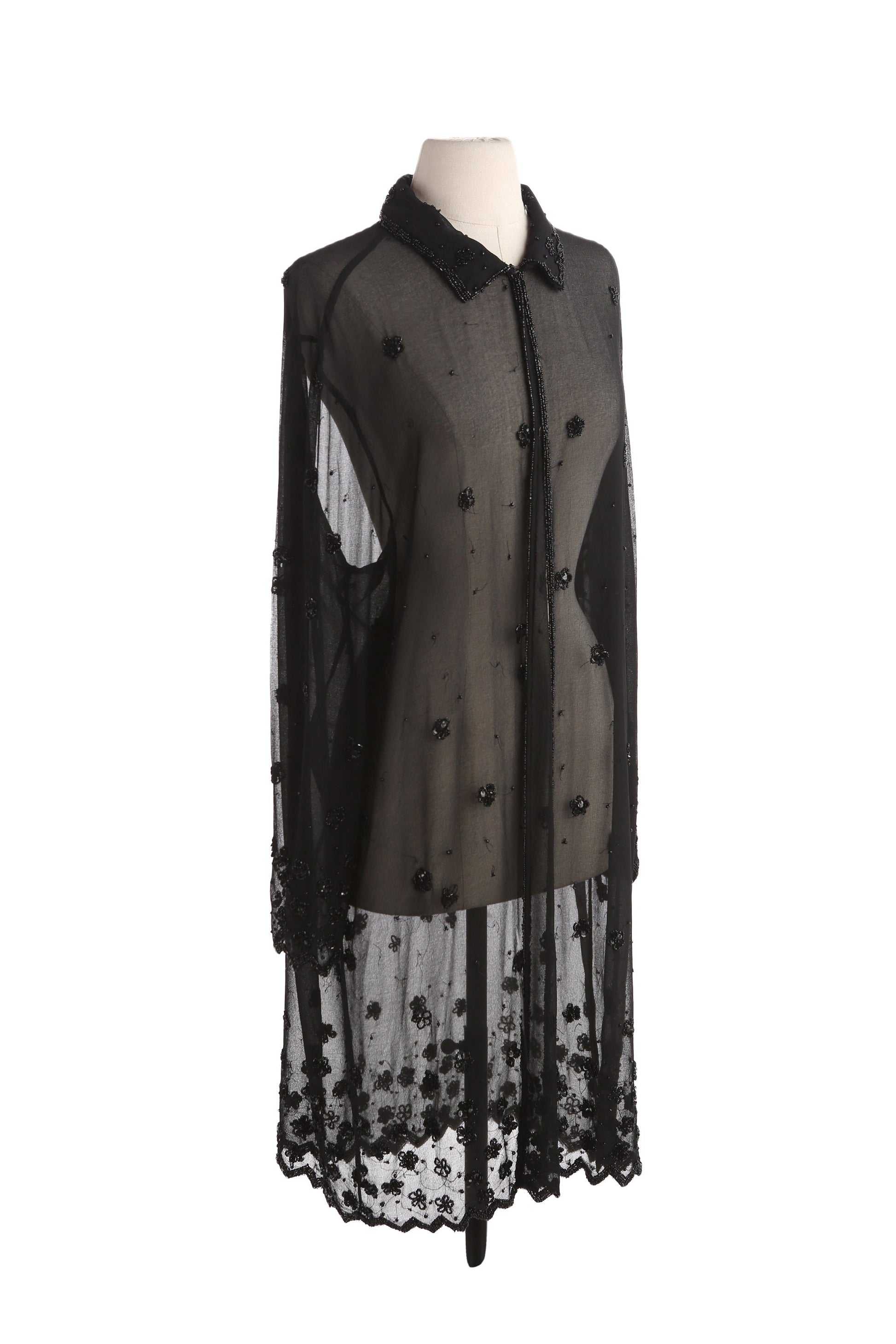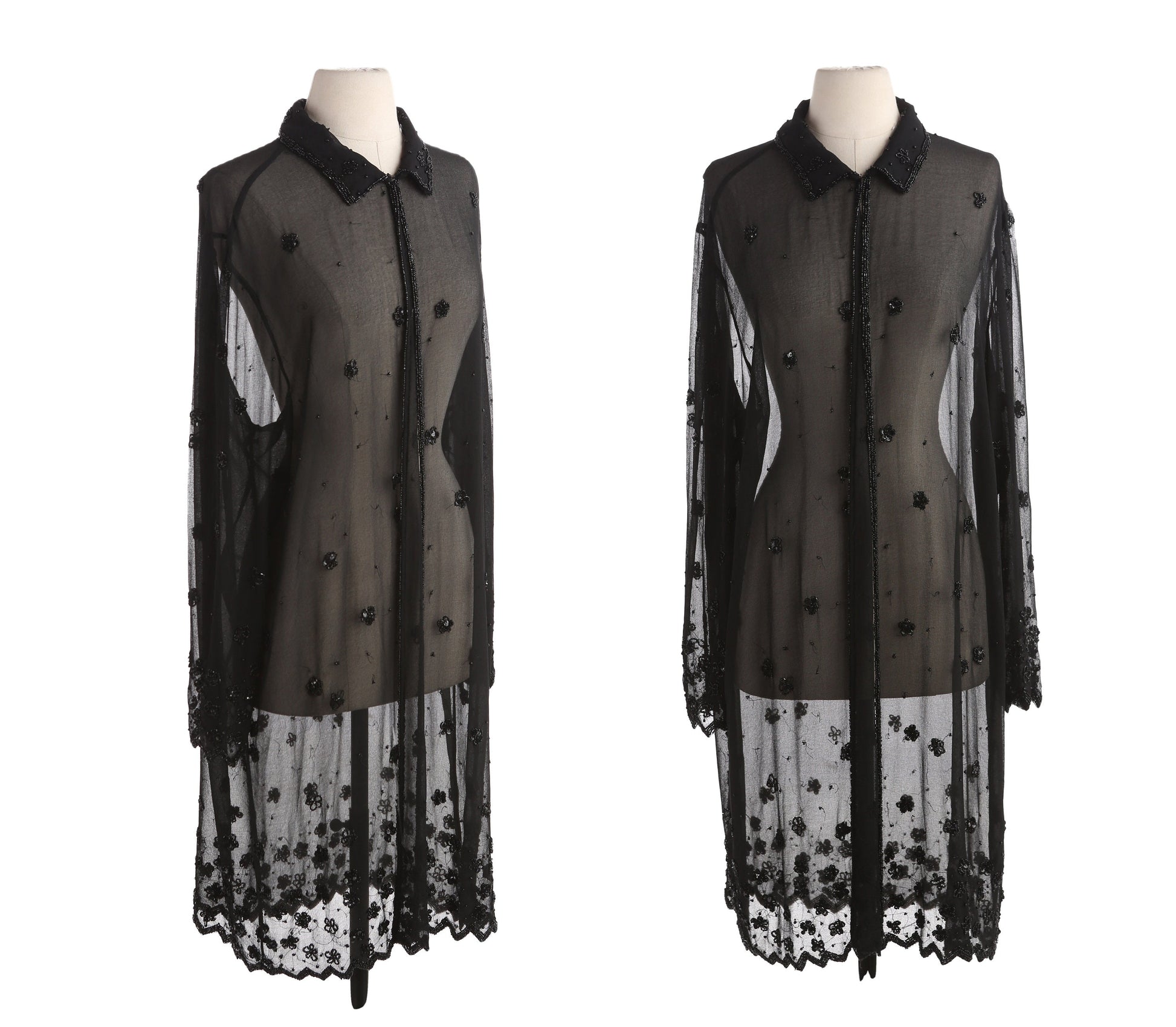 Vintage Women Long Sleeve Black Sheer Dress with Sequin Flower Design Details by JMD New York