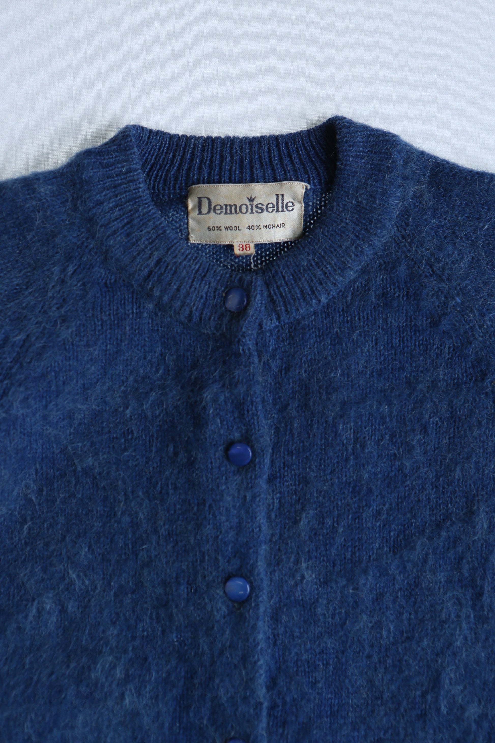 Vintage women sweater button up cardigan blue mohair 60's 50's 38 demoiselle made in usa