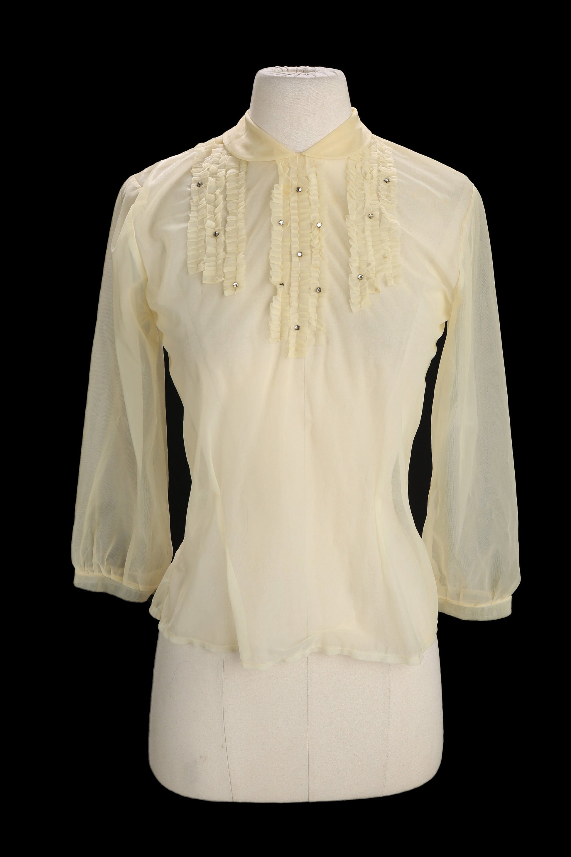 Vintage Women White Sheer Ruffle Detail Collar Blouse