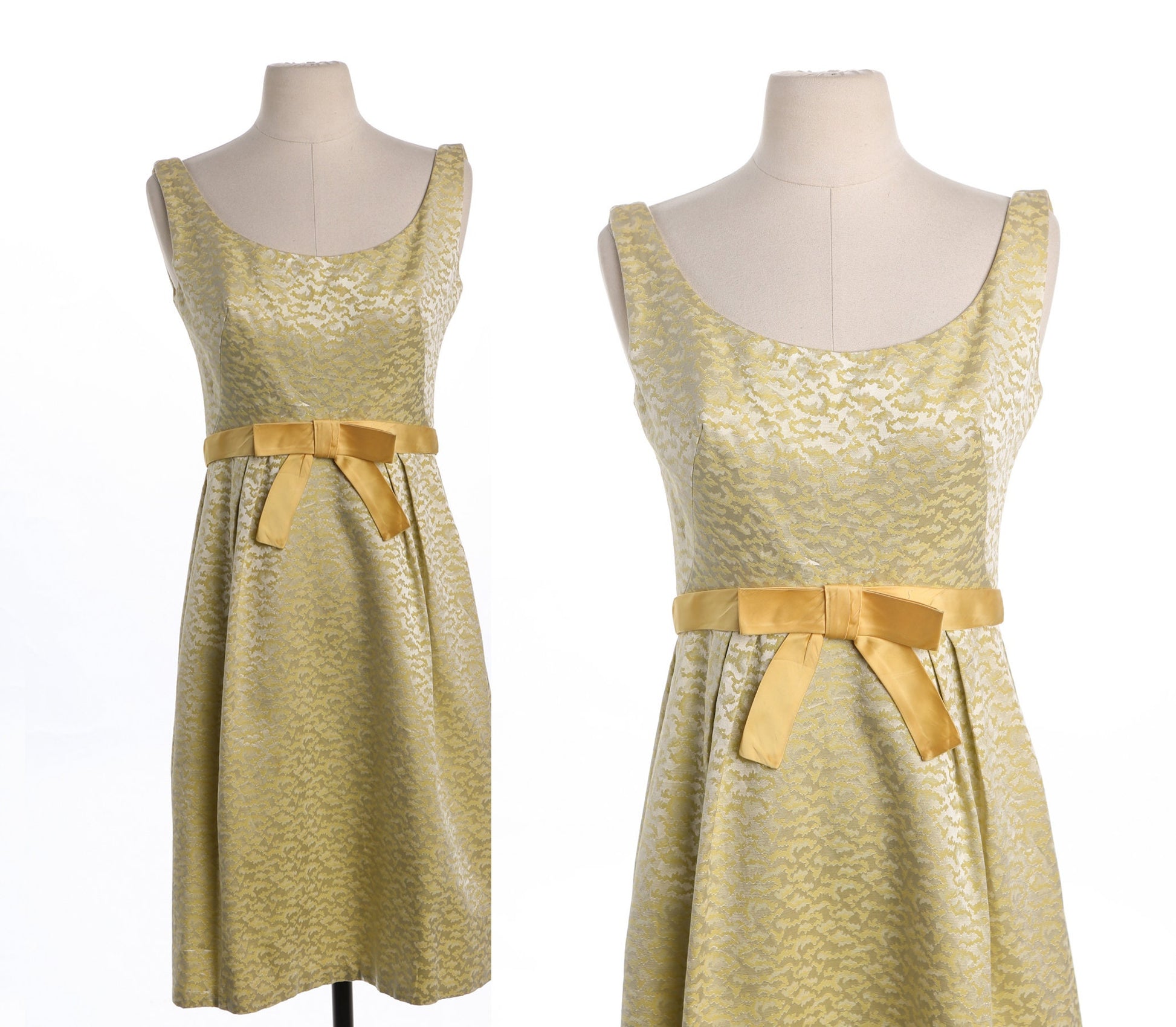 Vintage Women Yellow Brocade Evening Dress - Era 50's - 60's - Front Bow Details