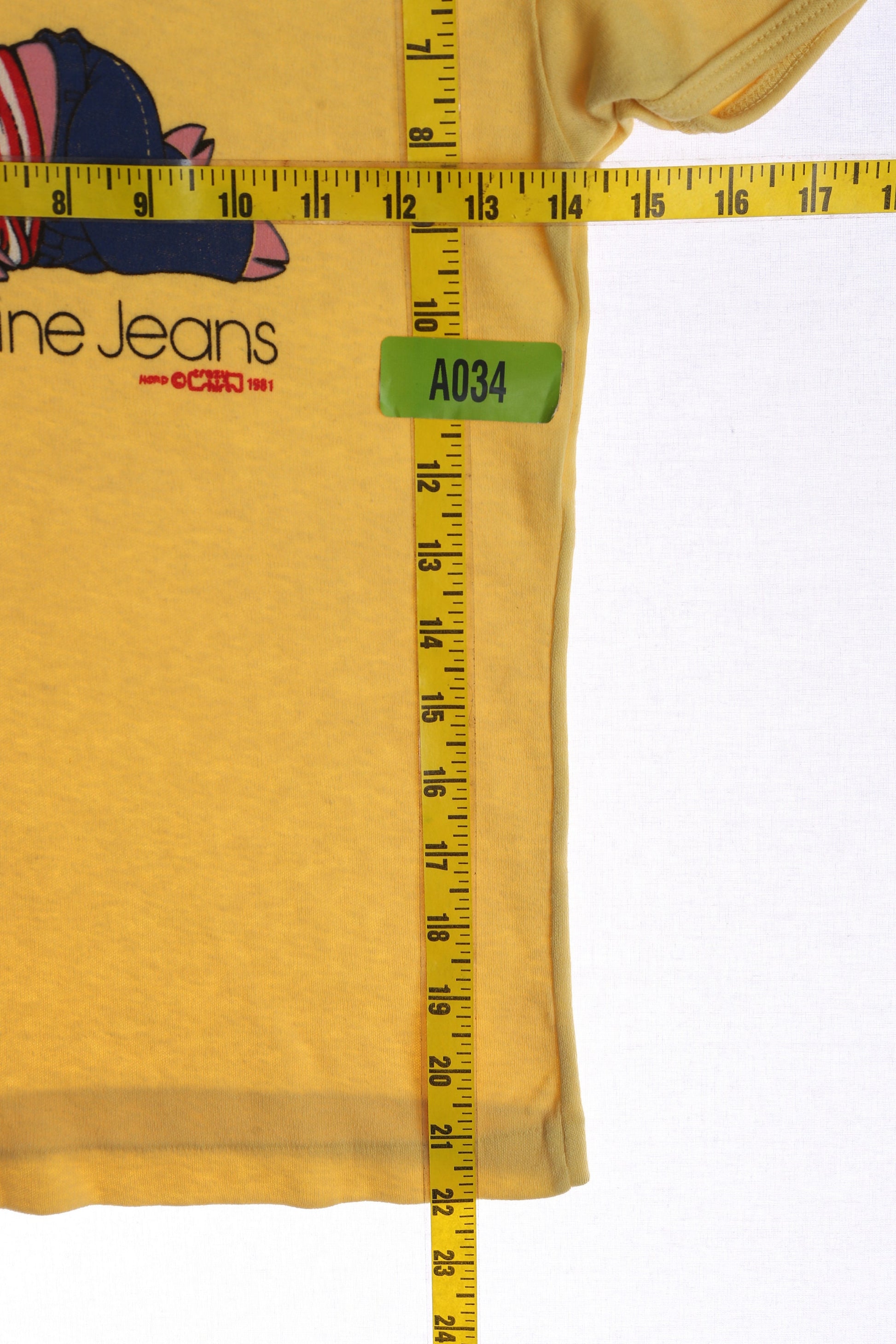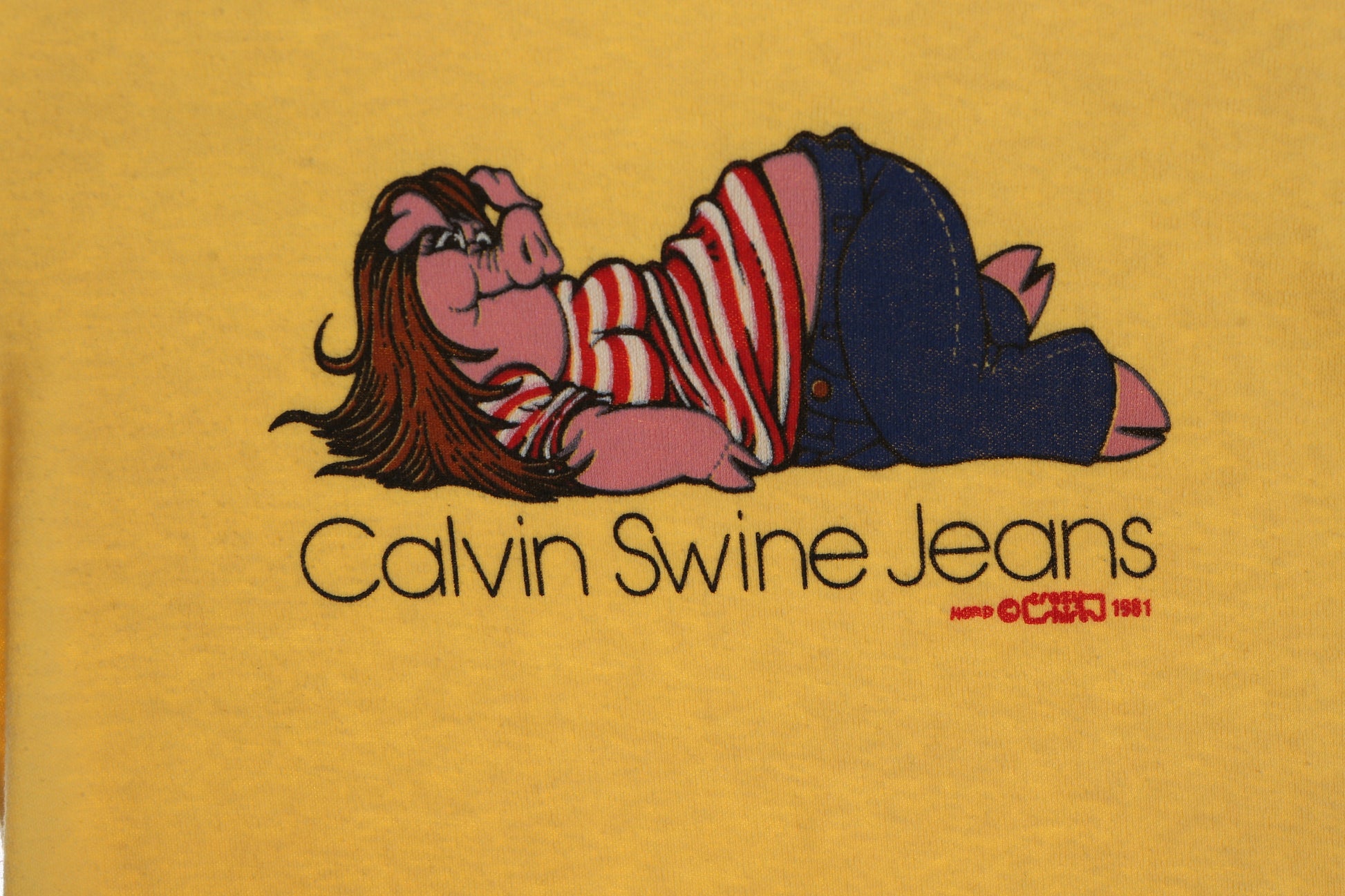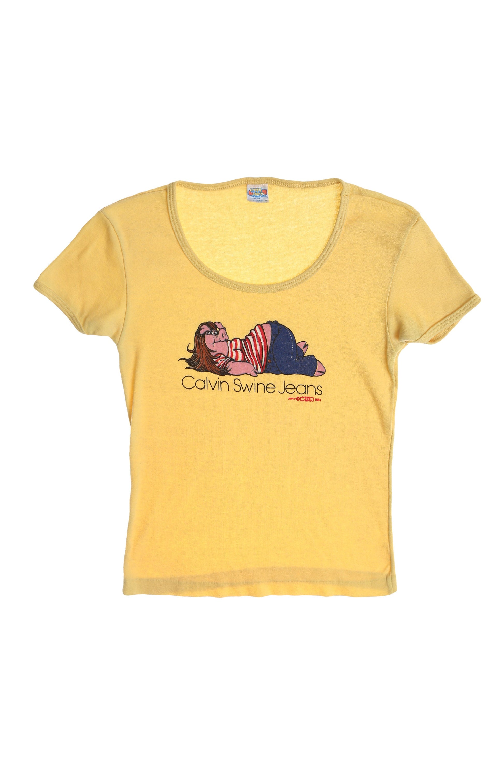 Vintage Women Yellow Graphic T-shirt - 1980s Calvin Swine Jeans by Crazy Shirt