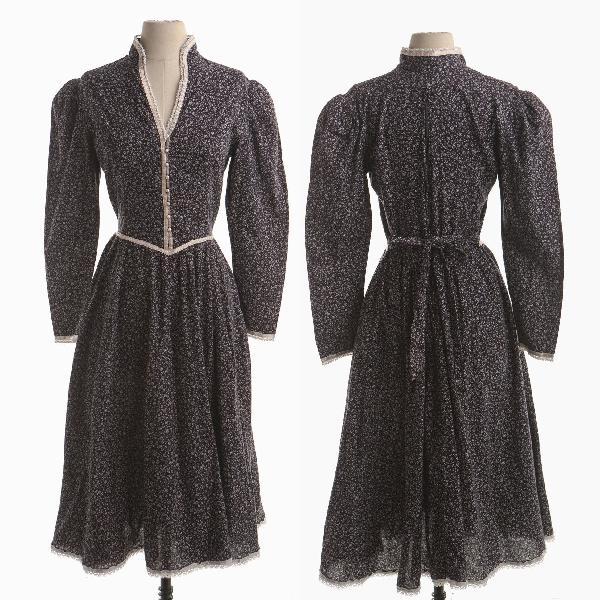 Vintage Gunne Sax Dress / Black / Floral Print / Deep V Neck / Long Sleeve